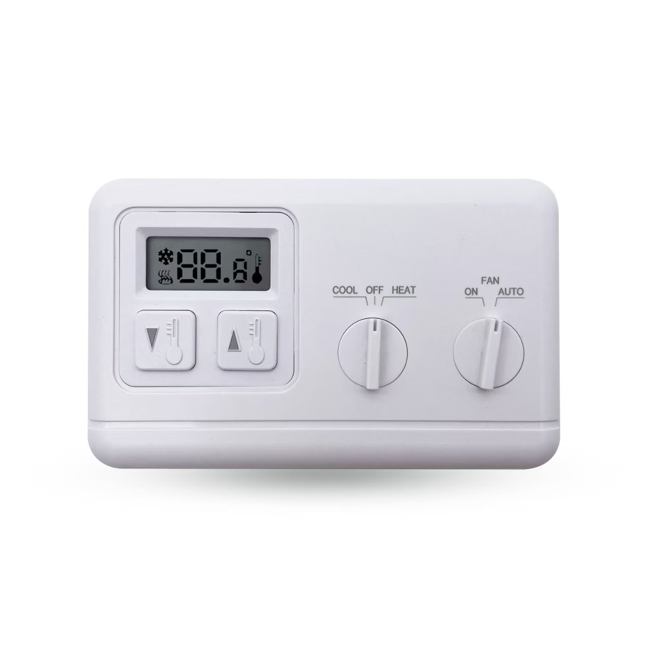 AC0044 is a 24V heat pump thermostat designed for central air conditioning systems,supporting single-stage heating and cooling with battery-powered operation.