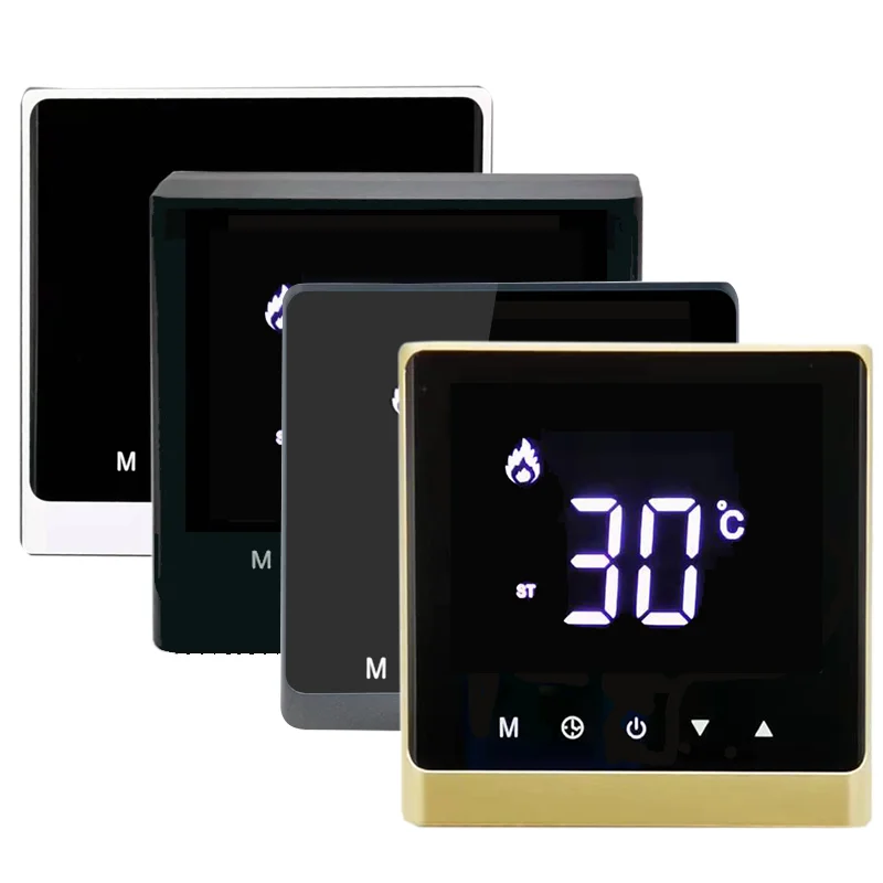 The thermostat is equipped with a digital LCD display that simultaneously shows room temperature and the set temperature, allowing users to clearly monitor and adjust indoor comfort levels.